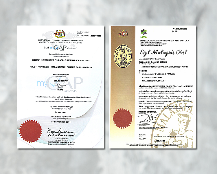 ROMPINE is committed to maintaining its high quality standards to all customers. As such, ROMPINE plantation has successfully obtain MyGAP and Malaysia Best.
