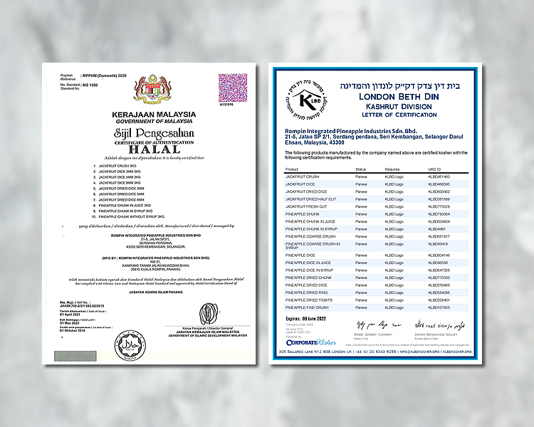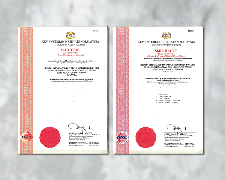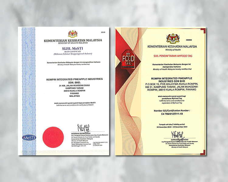 Our manufacturing facilities have achieved a series of accreditations such as Ministry of Health Malaysia GMP, Ministry of Health Malaysia HACCP, GIC ISO9001:2015, GIC ISO22000:2018, MESTI, MyFoodTAG, HALAL, Kosher, USFDA and BRCGC certification to reflect our commitment.